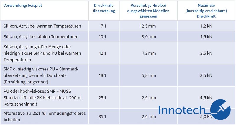 Es gibt manuelle Kartuschenpressen mit unterschiedlichen Kraftübersetzungsverhältnissen. Je nach Modell können diese bei 7:1, 10:1, 12:1, 18:1, 25:1 bis 35:1 liegen. Das heißt, dass mit einer Druckausübung von 1 kg am Handgriff, je nach Modell, zwischen 7 kg und 35 kg Druck auf die Kartusche ausgeübt wird.