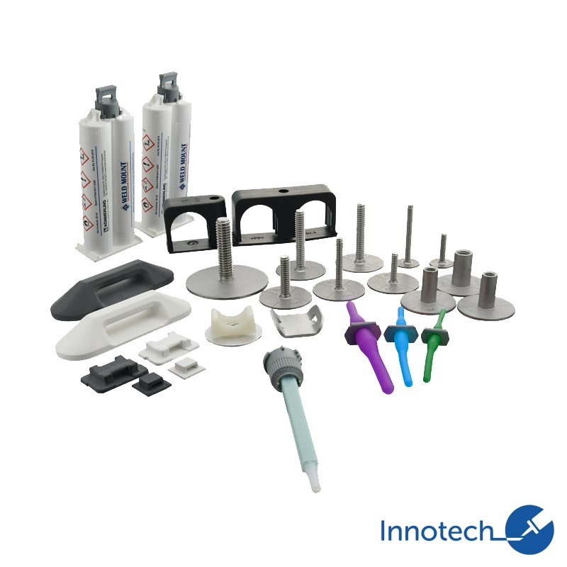 Weld Mount kombiniert spezielle 2-Komponenten-Acrylat-Klebstoffe mit einem kompletten Sortiment an Klemm- und Befestigungselementen (Gewindebolzen, Montageplatten, Kabelhalter u.v.m.). Die Lösung erlaubt das Montieren von Befestigungen auf unterschiedlichsten Oberflächen, ohne Verletzung des Untergrunds.