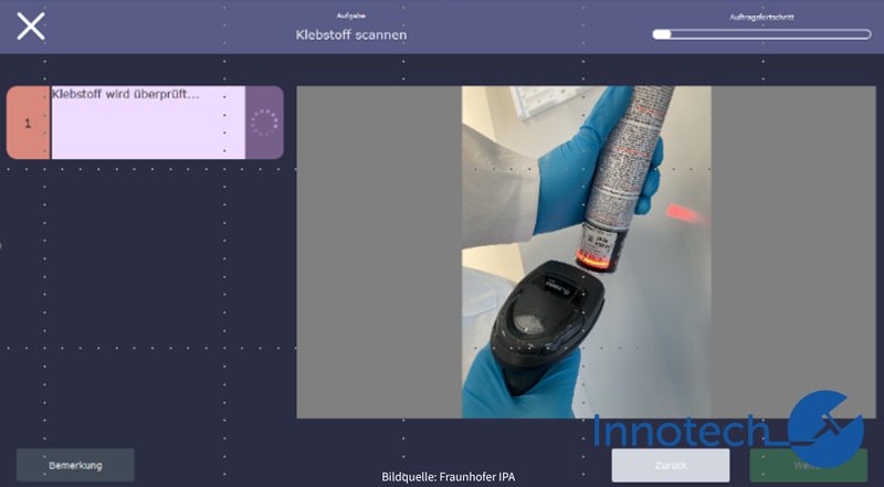 Im Rahmen eines Forschungsprojekts der Innotech Marketing und Konfektion Rot GmbH mit dem Fraunhofer IPA wurden innovative Ansätze aus der Arbeitsplatzgestaltung mit Ansätzen aus der digitalen Prozessüberwachung und –steuerung kombiniert. Dabei wurde mit der Entwicklung des „Smarten manuellen Klebarbeitsplatzes“ ein Technologie-Demonstrator zur Verfügung gestellt, welcher Einblicke in aktuelle Automatisierungs- und Digitalisierungspotentiale in der manuellen Fertigung ermöglicht. Der Fokus lag hierbei speziell auf dem Bereich der Klebtechnologie.